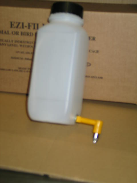 Click to enlarge Approx. size of 1000cc square bottle 85mm x 85mm x 216mm tall – nozzle protrudes approx 45mm | Product Description EZI-FILLA 1000cc drinking container An ideal drinking bottle for Rabbits, guinea pigs and small birds. If you presently use conventional ball bearing water bottles then you probably experience such problems as: 1) Having to remove the bottle to fill it 2) Having to fill it to the top with water to minimize its dripping 3) Constantly getting the tube chewed and then leaking badly 4) Dropping the bottle and breaking it 5) Cracking bottles due to changes of temperature 6) Leaking bottles due to hot weather 7) The constant rattling of the ball bearing whilst animal is drinking. 8) The ongoing cost of constantly replacing these bottles HOW CAN ‘EZI-FILLA’ SAVE YOUR VALUABLE TIME AND MONEY? 1) The bottle easily fixes to most wire cages and hutches with the spring provided, and can be filled to any level of water without removing it from cage or hutch 2) For multiple cage systems you could remove the bottle cap with one hand, and by using a hosepipe or watering can (as examples) you can replace the water in a fraction of the time taken, rather than having to remove bottles. 3) Bottles need only be removed for cleaning, and this is much easier as EZI-FILLA bottles have wide necks 4) Due to the design of EZI-FILLA the drinking nozzle is long enough to attach to your solid wooden hutch sides or doors. (first by drilling a 20mm hole through the wood) 5) The very strong stainless steel drinking valve will not get chewed and should not leak. 6) The stainless steel drinking valve is much quieter when the animal is drinking, and being very sensitive when touched gives a good flow of water, that immediately shuts off (without drips) once the animal stops touching it. 7) Due to the drinking nozzle being vertical, not only does this encourage your babies to start drinking more easily but minimizes the chances of hay, straw, food etc getting stuck in the nozzle. (protruding straw etc. can be very harmful to babies eyes) 8) The plastic bottle itself is virtually indestructible, and due to temperature variations should not break or leak, thus saving constant replacement costs. valve opperated so shouldn't drip or leak. WHAT TO DO IF YOUR EZI-FILLA STARTS TO DRIP Firstly observe your ezi-filla for a few moments to be sure the valve is dripping. On some occasions any wet patches on your hutch floor can be due to your pet playing with valve. If you are sure it is the valve leaking, then the most common reason is something stuck in the valve. Generally a minute particle (often more common in hard water areas) gets stuck in the valve. This can also occur if any sticky type medications have been used in the water. This is easily resolved by removing THE STAINLESS STEEL VALVE from the plastic elbow (pliers or a small spanner may be required the first few times) Clean the shoulders of the two parts inside (often just a wipe with your fingers will suffice) and replace. This should stop any dripping. | |
